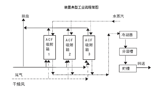 活性炭纤维废气吸附净化回收装置是利用活性炭纤维对有机溶剂的强吸附性而开发的。它采用吸附浓缩-脱附再生-溶剂分离回收的工艺流程而设计的由并联的两个或三个活性炭纤维吸附器和一套脱附回收装置组成,适合于低浓度大风量的有机废气的净化治理。它具有技术成熟,性能稳定,吸附能力强,可回收有机物,尾气排放浓度低、安全可靠等优点。